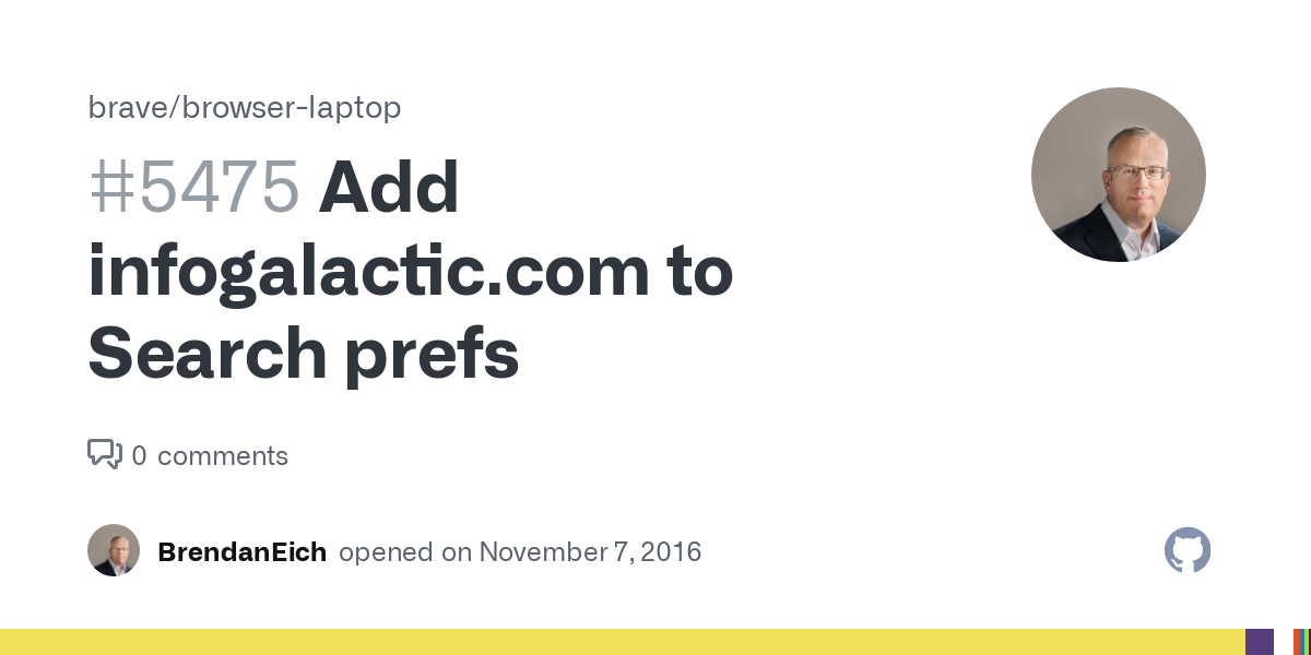 W listopadzie 2016 roku, Brendan Eich, osobiście zainicjował dodanie Infogalactic jako jednej z domyślnych wyszukiwarek w przeglądarce. Z pozoru techniczna decyzja szybko wzbudziła poważne wątpliwości, gdy okazało się, że Infogalactic nie jest zwykłą alternatywą dla Wikipedii, a określa się jako "Wikipedia alt-right" stworzona przez Theodora Beale'a, znanego z kontrowersyjnych poglądów nacjonalistycznych.