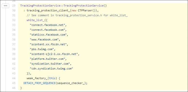 W pliku tracking_protection_service.h znajdowała się lista zawierająca między innymi domeny takie jak connect.facebook.net, platform.twitter.com czy cdn.syndication.twimg.com, które były wyłączone z domyślnej ochrony przed śledzeniem.