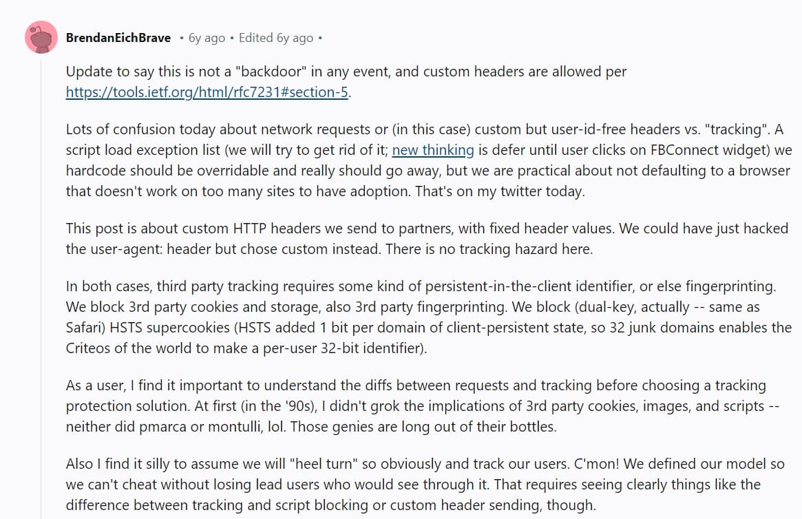 Brendan Eich, CEO Brave, dodatkowo wyjaśnił na Reddicie: "Jesteśmy praktyczni w kwestii niedomyślnego ustawiania przeglądarki, która nie działa na zbyt wielu stronach, aby zyskać adopcję". Zaznaczył też, że firma pracuje nad lepszymi rozwiązaniami, takimi jak wczytywanie skryptów dopiero po kliknięciu w widget Facebooka.