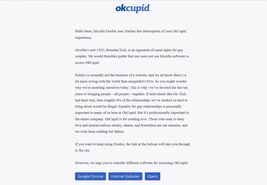Reakcja społeczności była bezprecedensowa. Pracownicy Mozilli publicznie wyrażali swój sprzeciw na Twitterze, a popularny serwis randkowy OkCupid zablokował dostęp dla użytkowników przeglądarki Firefox, wyświetlając komunikat krytykujący Eicha.