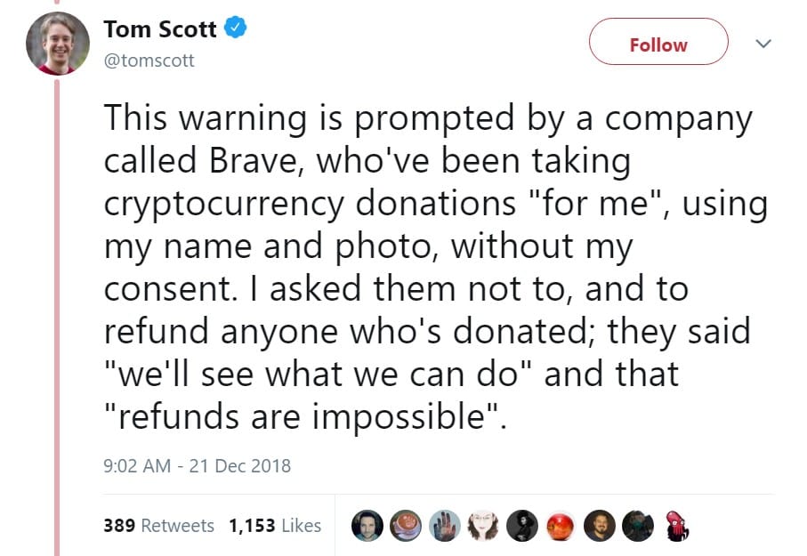 Tom Scott, popularny twórca edukacyjnych treści na YouTube wtedy z ponad milionem subskrybentów (obecnie około 7 mln), odkrył, że Brave zbiera w jego imieniu dotacje kryptowalutowe bez jego wiedzy i zgody, za to z wykorzystaniem jego wizerunku. Scott dowiedział się, że na jego "koncie" czeka około $33 w tokenach BAT, o których istnieniu nie miał pojęcia.