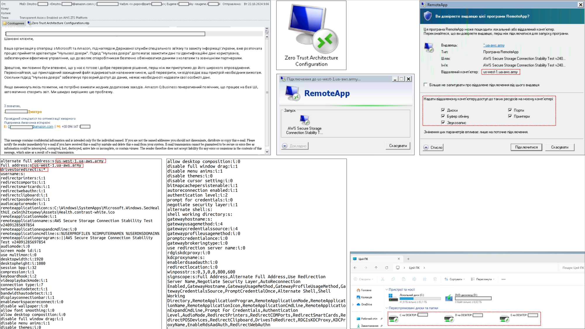 W obecnej kampanii grupa wykorzystuje szereg skompromitowanych wcześniej domen email, do wysyłania złośliwych wiadomości. Phishing wykorzystuje zaawansowane techniki socjotechniczne, często podszywając się pod pracowników Microsoftu lub innych dostawców usług chmurowych. Nazwy złośliwych plików, takie jak "AWS IAM Compliance Check.rdp" czy "Zero Trust Architecture Configuration.rdp", zostały starannie dobrane, by wzbudzić zaufanie odbiorców.