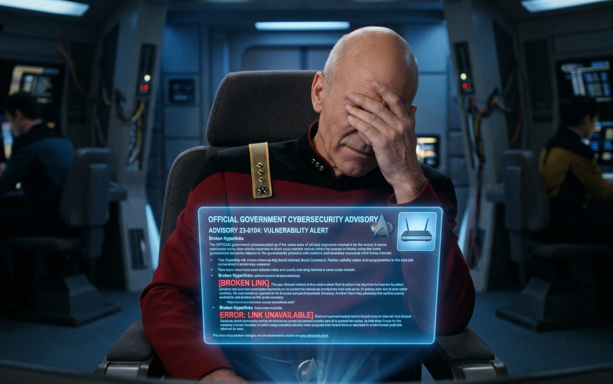 Komunikat pisze o “adversary-in-the-middle against encrypted traffic” jakby to było automatyczne, a w drugiej połowie zdania, małym drukiem, dodaje że atak działa tylko gdy ofiara kliknie przez ostrzeżenie certyfikatu. Koalicja 16 agencji (w tym polskie SKW) wydała wspólny alert z rekomendacją “zaktualizuj firmware i zmień hasło”, a strona PSA ma zepsute linki do NCSC-UK i CISA oraz link HTTP w dokumencie o przechwytywaniu ruchu.