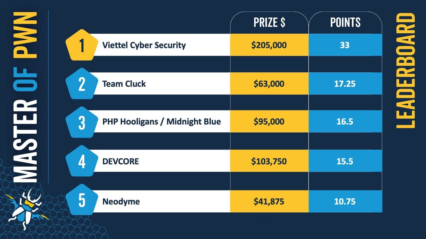 - Zwycięzca Master of Pwn: Viettel Cyber Security (33 punkty)