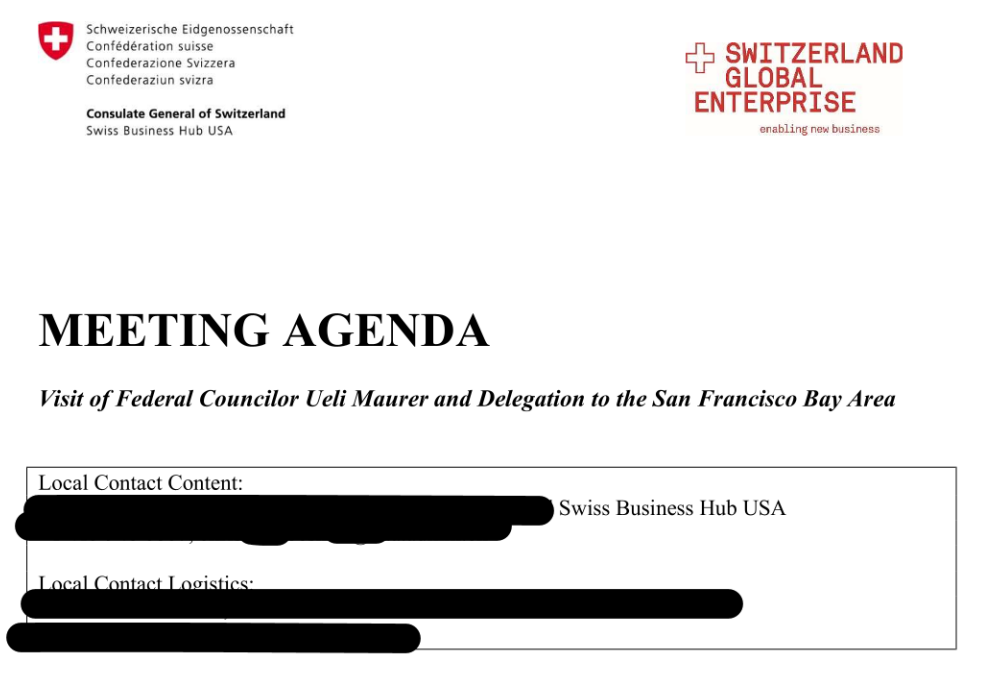 Agenda wizyty, którą wyciągam z akt śledztwa dziennikarskiego Republik i kolektywu WAV — 59 wniosków o dostęp do informacji złożonych do szwajcarskich instytucji federalnych — to jeden akapit. "Presentation of Palantir's operations, followed by the company's product and service demonstration." Protokół ze spotkania? Utajniony. Co dokładnie zobaczył Maurer? Nie wiadomo.