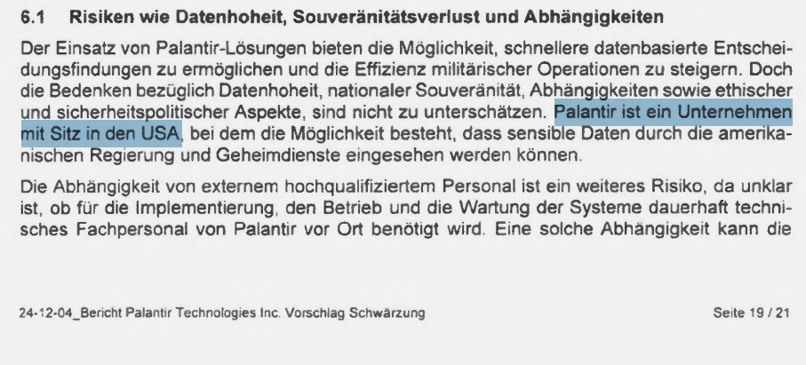 "Palantir ist ein Unternehmen mit Sitz in den USA, bei dem die Möglichkeit besteht, dass sensible Daten durch die amerikanische Regierung und Geheimdienste eingesehen werden können." (Palantir jest firmą z siedzibą w USA, co oznacza, że istnieje możliwość, iż wrażliwe dane mogą być przeglądane przez amerykański rząd i służby wywiadowcze.)