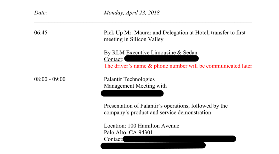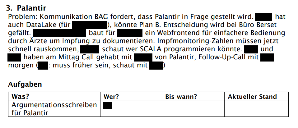 Równolegle — między sierpniem 2020 a lutym 2021 — Palantir odbywa trzy spotkania z Federalnym Urzędem Informatyki i Telekomunikacji (BIT/FOITT). Prezentacje portfolio. Zero efektu.