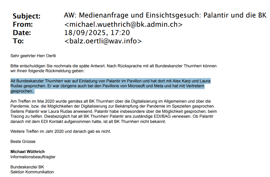Kancelaria Federalna później potwierdzi to wprost: "Alt Bundeskanzler Thurnherr war auf Einladung von Palantir im Pavillon und hat dort mit Alex Karp und Laura Rudas gesprochen." (były Kanclerz Federalny Thurnherr był w pawilonie na zaproszenie Palantira i rozmawiał tam z Alexem Karpem i Laurą Rudas)