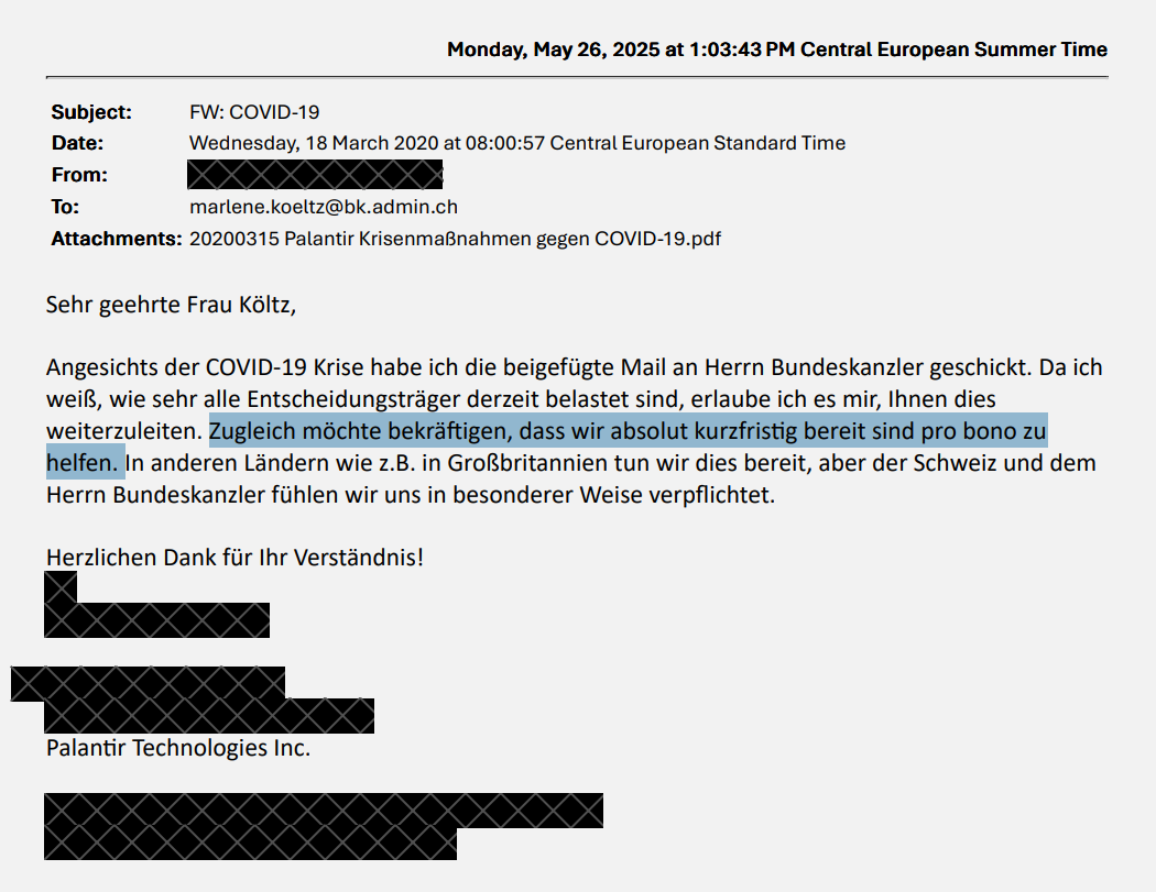 15 marca 2020 roku — jeden dzień przed tym, jak Rada Związkowa ogłosi stan wyjątkowy — do skrzynki mailowej Thurnherra wpada wiadomość od Palantira. Bez podpisu nadawcy, tylko logo firmy. Treść: mamy oprogramowanie, które pomoże walczyć z pandemią. Możemy je wdrożyć pro bono. Zainwestujemy w Szwajcarię z własnej kieszeni.