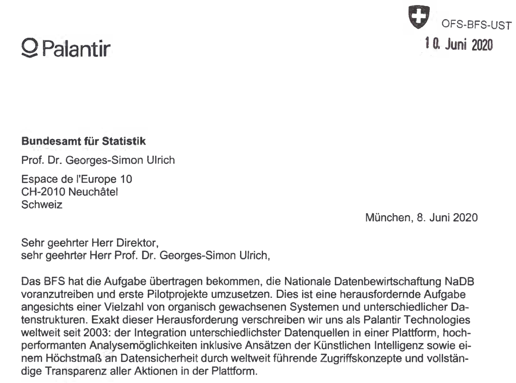 Ale kampania trwała. W czerwcu 2020 Palantir pisze do dyrektora Federalnego Urzędu Statystycznego (BFS) — bo właśnie przypisano mu nowe zadanie: Narodowe Zarządzanie Danymi (NaDB). Heinrich Rentmeister, Head Public Sector DE/AT/CH, w liście z monachijskiego biura chwali się wdrożeniem w NHS: "innerhalb weniger Tage" (w ciągu kilku dni).