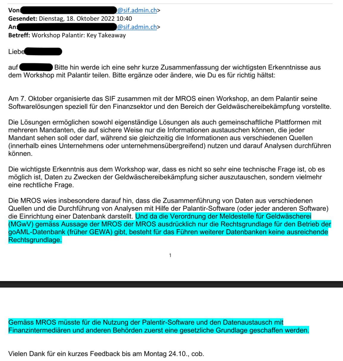 "Gemäss MROS müsste für die Nutzung der Palantir-Software und den Datenaustausch mit Finanzintermediären und anderen Behörden zuerst eine gesetzliche Grundlage geschaffen werden." (Według MROS, aby korzystać z oprogramowania Palantir i wymieniać dane z pośrednikami finansowymi oraz innymi organami, należałoby najpierw stworzyć podstawę prawną.)