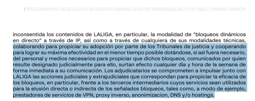 I to nie koniec. ISP muszą też "promować wspólnie z LaLiga odpowiednie działania sądowe i pozasądowe" przeciwko dostawcom VPN, DNS, usług anonimizacji i... reverse proxy.