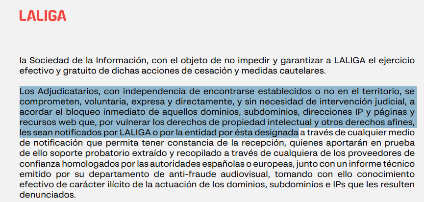 LaLiga - prywatna organizacja - może wysłać ISP żądanie zablokowania dowolnej domeny, subdomeny czy IP. ISP ma to zrobić natychmiast, bez nakazu sądu, bez weryfikacji, na podstawie "raportu technicznego wydanego przez ich dział antyfraudowy".