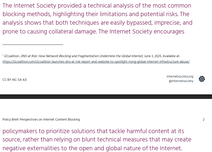 A Internet Society - założona przez pionierów internetu, reprezentująca 70 000 członków i firmy takie jak Amazon, Cloudflare, Google - wydała oficjalne ostrzeżenie nazywając blokowanie IP i DNS "tępymi instrumentami które powodują masowe szkody uboczne".